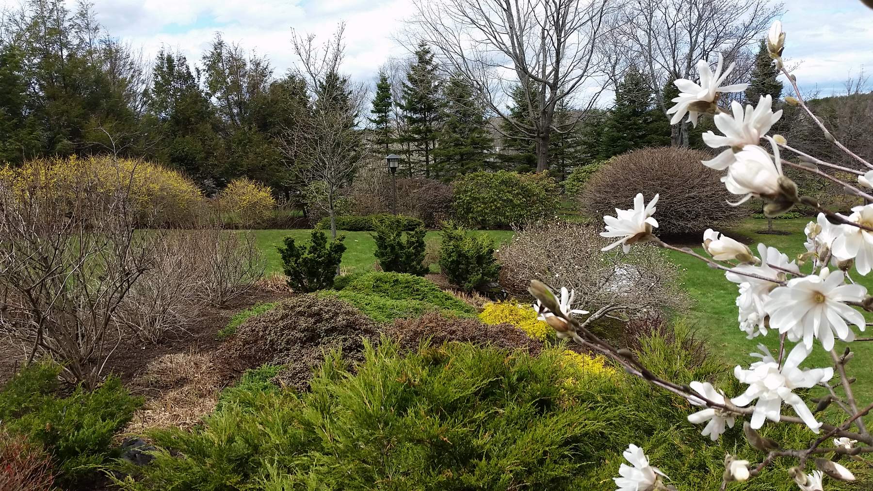 This photo I took last week at a client’s garden in Saint John, and I purposely kept the gorgeous star magnolia blooms off to the side so you could see the much larger and older individual in the distance. Its flower buds are just beginning to show a bit of white, approximately two weeks behind the one in the foreground. Though you can’t tell in this shot, the nearer magnolia is planted four feet out from a south facing wall, with brown siding behind it, and shelter from the northwest wind. That warm microclimate allowed that magnolia to bloom two weeks earlier than its counterpart on the north-facing bank, which is the opposite to a south-facing wall in microclimatic terms. This could be useful information to you at your house, if you are considering trying a perennial or shrub that is considered delicate, eg., a zone 6 plant. Blue hydrangea (commonly sold in box stores in full bloom) would be a good example, or a hybrid rose, as plants that often succumb to winter cold. Pick the warmest microclimate you can find around your house, typically, as this one is, against the foundation on the south or east-facing wall, to try the delicate plant. Regardless of your success, please don’t come to me for a guarantee replacement!
